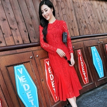 清仓 98包邮女装秋季长袖蕾丝修身鱼尾拼接包臀中长裙连衣裙红色