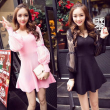 2016新款春装连衣裙女蕾丝长袖打底裙a字裙韩版修身V领针织打底衫