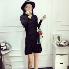 V领紧身打底衫女秋冬纯色荷叶边针织毛衣韩版套头显瘦鱼尾连衣裙