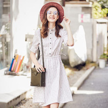 衣香丽影2017夏装新款条纹印花松紧腰全棉衬衫领短袖A字连衣裙女
