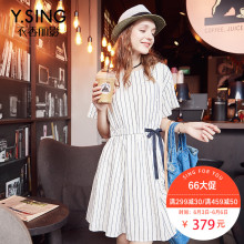衣香丽影2017夏装新款系带松紧腰修身显瘦短袖条纹连衣裙A字裙子