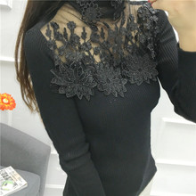春秋韩版时尚性感蕾丝拼接镂空针织衫打底显瘦修身弹力套头毛衣女