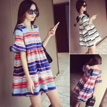 孕妇夏装连衣裙2017新款夏季短袖孕妇装百褶雪纺裙宽松条纹孕妇裙