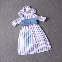 欧洲站2017春装新款长袖修身中长款条纹衬衣+背心连衣裙两件套装