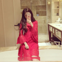 2017春韩版重工奢华名媛气质显瘦喇叭袖蕾丝礼服中长款A字连衣裙