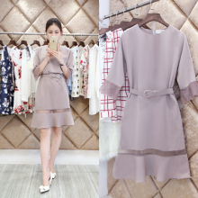名媛2017新款女装夏装韩版修身网纱拼接收腰雪纺中袖连衣裙中裙女