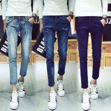 潮男破洞牛仔裤小脚九分裤 春夏季韩版修身青少年学生显瘦9分裤子