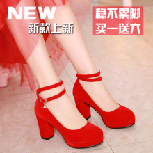 中式婚鞋女粗跟新娘鞋红色高跟鞋绑带中跟敬酒结婚红鞋孕妇伴娘鞋