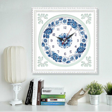 新款印花十字绣时钟优雅兰花青花瓷清新简约花卉卧室挂钟表送机芯