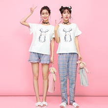 睡衣女夏短袖长裤纯棉韩版清新学生卡通可爱夏天格子家居服套装
