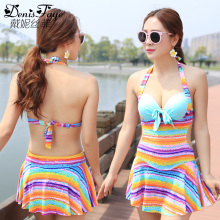 小香风泳衣女三件套分体裙式保守遮肚钢托聚拢比基尼学生温泉泳