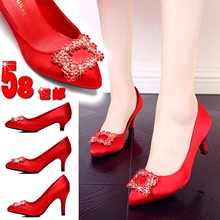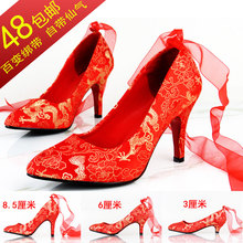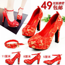 清仓包邮红色高跟婚鞋敬酒婚礼旗袍新娘鞋大红中跟女单鞋踩堂上轿