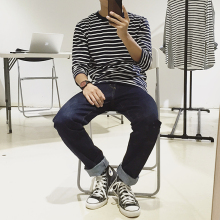 春季新款日系复古 圆领长袖条纹t恤海魂衫潮牌男式打底衫