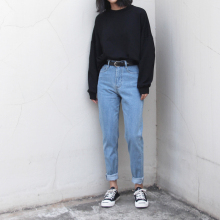 2016秋冬新款 街头复古风高腰宽松BF风无弹哈伦工装牛仔长裤 女