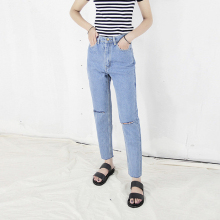 自制款 欧美复古高腰无弹膝盖破洞牛仔裤女 裤脚毛边直筒哈伦裤女