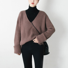 新款冬装 宽松超长袖堆堆袖V领针织衫加厚兔绒套头毛衣女士上衣