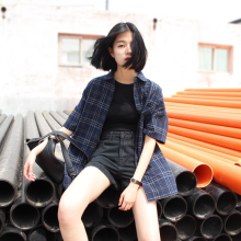 CHICVEN原创自制2017夏装新款宽松BF风短袖格子衬衫中长款开衫 女