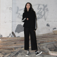 2017早春新款 宽松运动休闲学院风三条线连帽套头卫衣长袖女 原宿