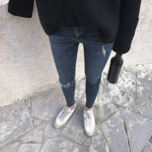 2017春夏新款韩版水洗做旧磨破毛边牛仔裤 修身显瘦九分铅笔裤 女