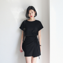 2017夏季新款圆领套头不规则拼接系带设计短袖T恤连衣裙中长款 女