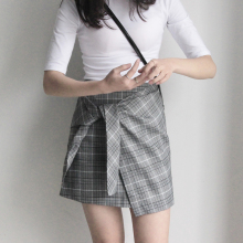 2017春夏韩国东大门新款 通勤不规则系带格子高腰A字半身一步短裙