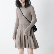 2017早春新款修身显瘦圆领套头鱼尾下摆喇叭袖针织连衣裙中长款女