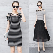 2017夏季新款韩版气质短袖露肩连衣裙修身显瘦时尚两件套装夏裙子