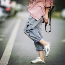 飘异第937个清晨原创春夏做旧水洗彩绘贴布宽松牛仔九分哈伦裤女