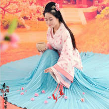 萌妹子年会汉服精品古装影楼主题淡粉拖尾汉服短裾闲庭院