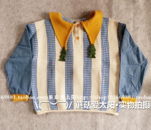 软妹 定制 几何小人 圣诞树拼接三角领蓝白条毛衣海军领牛仔袖