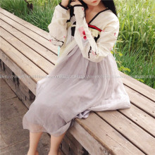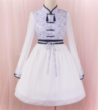 软妹少女国风古风汉元素青花-中华风青花瓷暗纹网纱拼接连衣裙