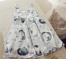回馈价 软妹夏日清新猫咪印花复古少女水色灰蓝色连衣裙吊带裙jsk