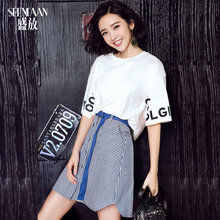 【唐艺昕同款】盛放2017夏装新款 蓝白条纹半身裙女 休闲腰带短裙