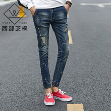 西部芝枫西部芝枫弹力透气修身小脚男士牛仔裤学生破洞磨白韩版潮