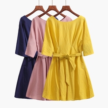 黄色棉麻连衣裙夏2017新款潮文艺五分袖中长款高腰a字宽松民族风