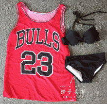 实拍篮球少女运动风泳衣boyfriend公牛纪念款罩衫字母分体比基尼