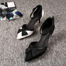 2017夏欧洲站新品尖头蝴蝶结马毛高跟凉鞋一字带包头中空细跟女鞋