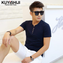 夏季鸡心领男士短袖T恤纯色韩版修身男装V领简约青年上衣体恤潮流
