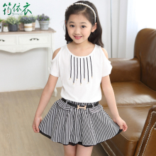 女童夏装2016新款韩版童装中大童露肩假两件套公主短袖条纹连衣裙
