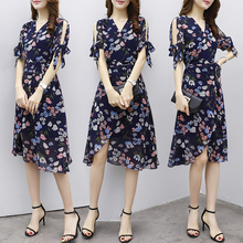 2017夏季新款露肩V领印花碎花雪纺连衣裙女中长款不规则收腰显瘦