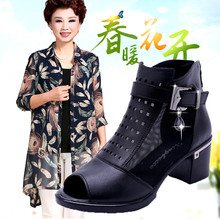 夏季中跟女网靴粗跟鱼嘴凉鞋中老年妈妈凉靴大码网布短靴镂空皮鞋