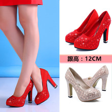 秋季新款婚鞋女新娘鞋女鞋红色单鞋水晶高跟粗跟防水台金色婚纱鞋