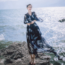 春秋季女装刺绣仙女神网纱蕾丝连衣裙长袖复古显瘦收腰度假长裙夏