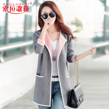 2016秋季新款大码女装拼色中长款针织开衫女宽松百搭女士毛衣外套