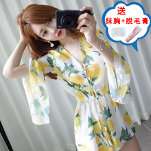 欧洲站夏V领花朵喇叭袖韩国海边度假装沙滩裤裙裤雪纺连体裤短裤