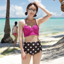 2017夏韩国代购圆点保守分体带钢托厚胸垫高腰比基尼泳衣女玫红色