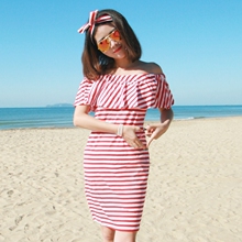 纯棉荷叶边一字领斜肩露肩露背韩版条纹海边度假连衣裙沙滩裙短裙