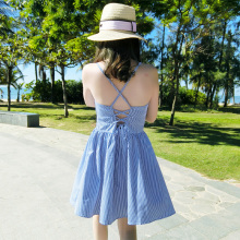 韩国旅游性感吊带交叉系带露背条纹海边度假短裙泰国沙滩裙连衣裙