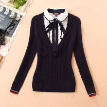 小熊维尼2017春秋款学院风衬衫领假两件少女针织衫纯棉中学生毛衣