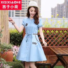 西子小荷夏装新款学生连衣裙A字裙少女短袖中长款牛仔连衣裙